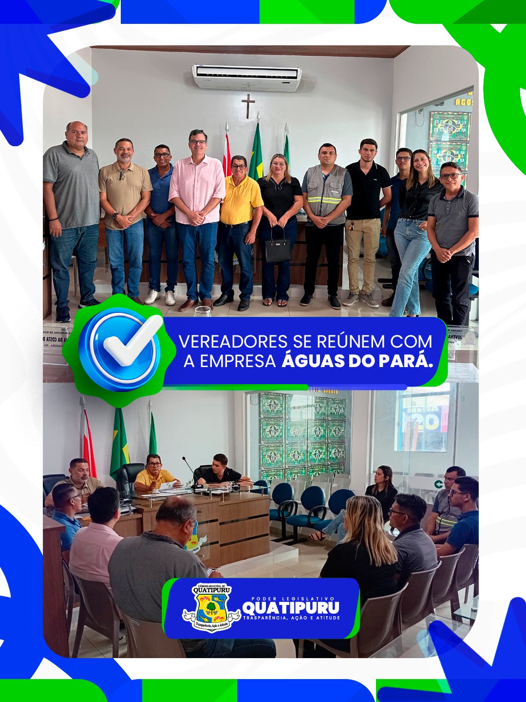 A Câmara Municipal de Quatipuru realizou hoje uma reunião entre os vereadores Manoel Aviz (Bilico), Kleber Alves, João Osmar, Benedito Martins (Pretinho da Passagem), Jucelina Costa (Celina do Pereca) e Lucas Galvão, com representantes da empresa Águas do Pará, nova responsável pelo fornecimento de água no município.